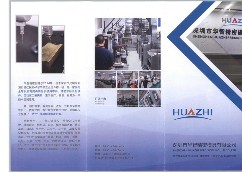華智精密創(chuàng)建于2014年,位于深圳市光明區(qū)新湖街道紅銀路41號華順工業(yè)園6棟一樓,是一家面向全球供應商提供高品質模具零件、精密非標及標準件、自動化工裝夾具,集于生產、銷售、服務為一體的中國制造商。基于客戶需求,我們務實、進取、并始終堅持高性價比、貨期快捷、專業(yè)技術支持的定位,為模具行業(yè)提供“一站式”模具零件解決方案。華智精密,工廠員工近百人,擁有CNC電腦鑼、精密磨床、線割機、銑床、精密自動水磨、數控車床,EDM,慢走絲,二次元、三次元、高度儀等全套設備,為模具行業(yè)高速發(fā)展提供專業(yè)服務 展望未來,我們將持續(xù)秉承“尊重、信任、積極、拼搏、誠信,價值、業(yè)績、創(chuàng)新“的經營理念,定位于客戶,社會,及我們的員工創(chuàng)造長遠的價值,并實現持續(xù)增長,成就塑膠模具行業(yè)的精彩,共創(chuàng)美好生活!